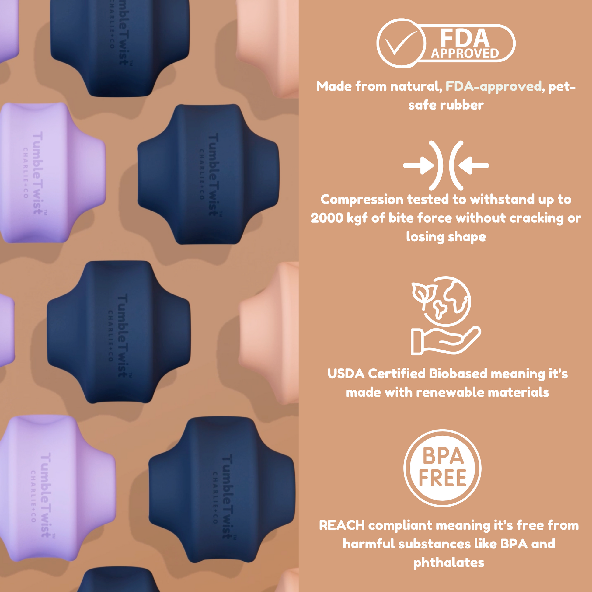 Crafted from natural, FDA Approved pet-safe rubber, the Tumble Twist is free from harmful substances like BPA and phthalates. It's compression tested and tough enough to withstand up to 2000 kgf of bite force without losing shape or cracking so you know it’s built to last—even for the most enthusiastic chewers.